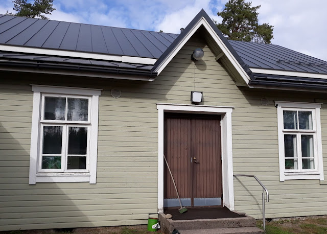 | Rakennuksen ulko-ovet ja katto on uusittu, lisäksi sisäikkunoita on uusittu osittain. Ulkoikkunat ovat alkuperäiset. (Niina Kauria, 2021) |